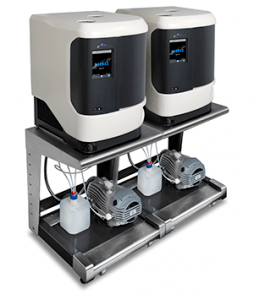 Chaque séparation produit 320 flacons au total, chacun avec un volume d’environ 45 ml. Le Genevac HT-24 (figure 2) a été choisi pour sécher les échantillons, car il comporte deux chambres de grande capacité de chargement de flacons. Les flacons utilisés pour collecter les fractions ne sont pas de taille standard, donc Genevac a conçu un support d’échantillon personnalisé. Le système peut évaporer 192 flacons à la fois (96 par chambre). En deux jours, toutes les fractions sont séchées et prêtes à être manipulées et testées. 285 flacons contiennent 45 ml de mélange de solvants organiques ternaires avec environ 5% d’eau. 35 flacons viennent d’un gradient d’acétonitrile d’eau, de 0 à 100%. Les conditions d’évaporation doivent être douce puisque la dégradation ou même l’évaporation des composés ciblés potentiels serait une perte considérable. Dans l’évaporateur, les conditions d’évaporation sont soigneusement contrôlées pour assurer une évaporation rapide et sûre. Le système Dri-Pure® intégré à l’évaporateur empêche les injections et la contamination croisée. Le logiciel du système, contrôle et surveille les pressions et les températures des échantillons. La mesure des températures se fait via un thermocouple placé dans le support d’échantillon, un autre thermocouple est placé dans un échantillon pour fournir des informations supplémentaires sur le processus d’évaporation.