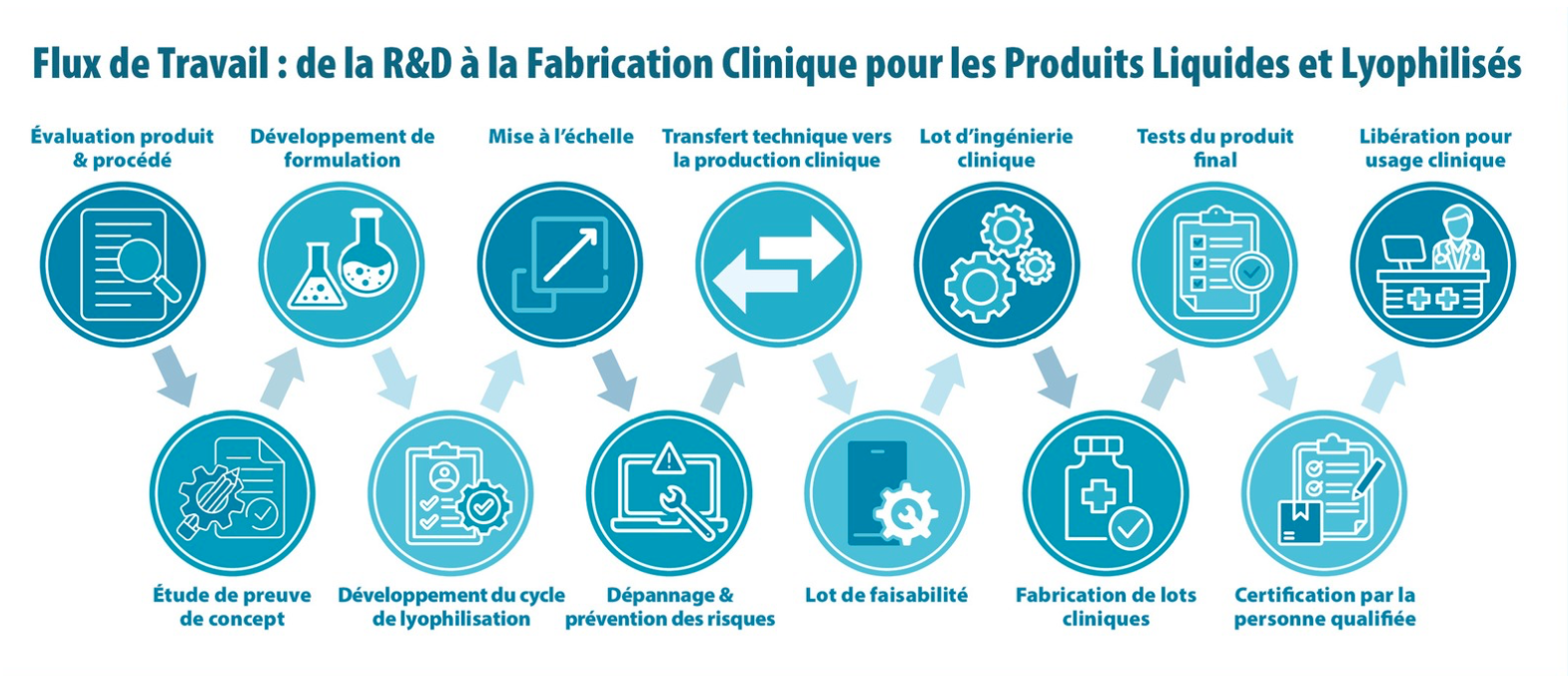 • Fabrication clinique: fill-finish aseptique (flacons, PFS), contrôle qualité et documentation complète.
